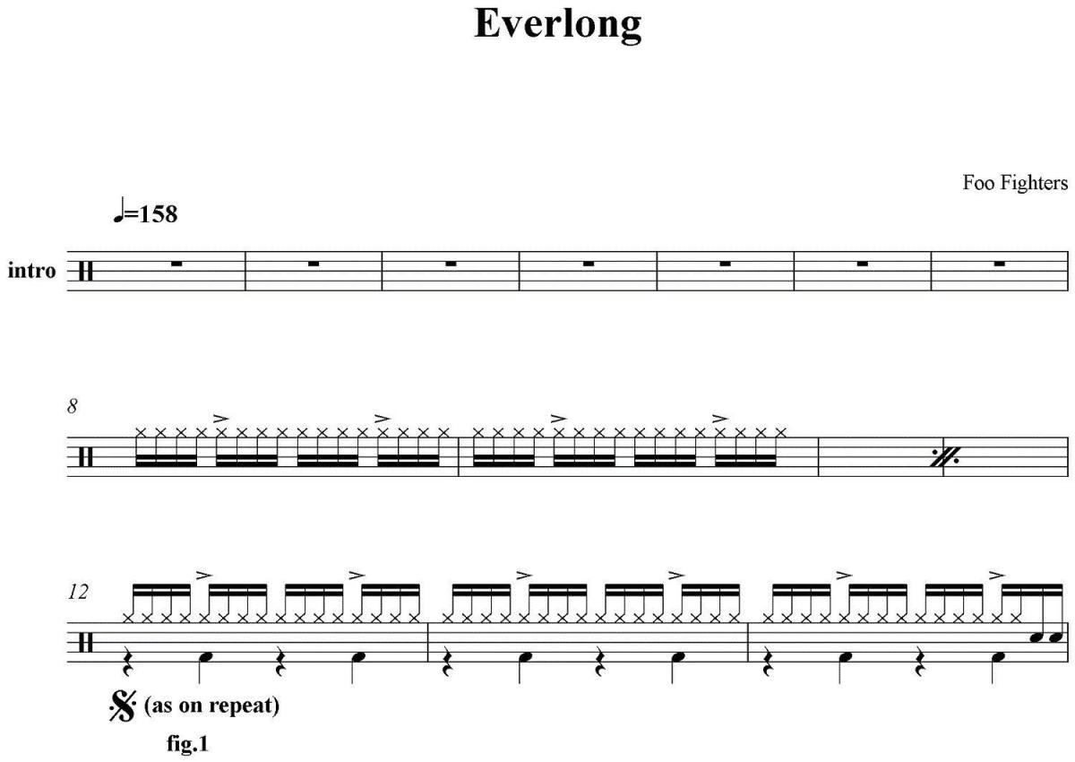 《Everlong》是Foo Fighters演唱的一首歌曲,拍号为4/4拍,歌曲速度为每分钟158拍,这份架子鼓谱共有三张高清图谱,图谱由 @音符喷血者 编配上传,图谱使用五线谱编配,使用这份Everlong架子鼓谱,你将能够轻松地敲打出这首Foo Fighters的Everlong,快来尝试吧。