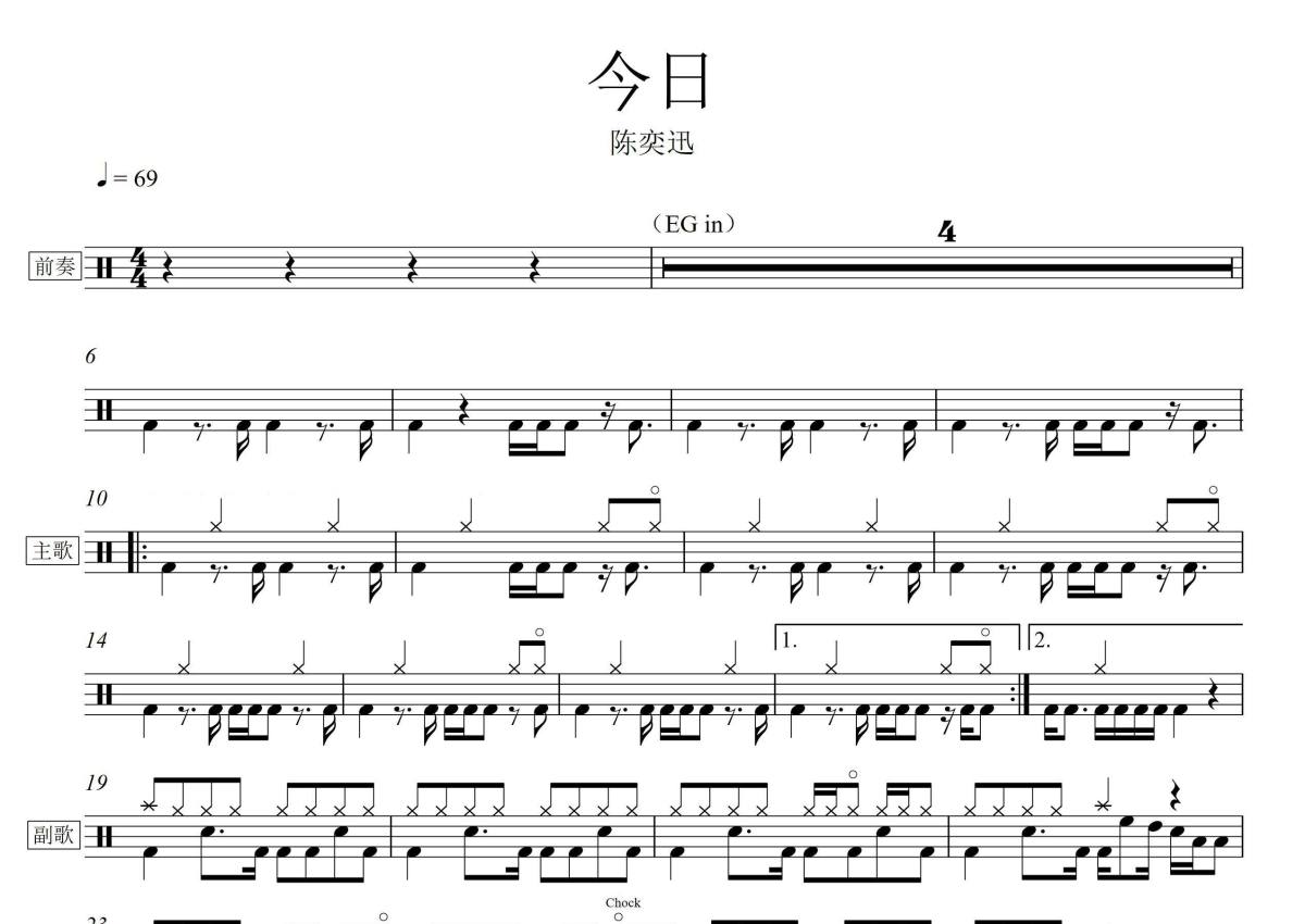 《今日》是陈奕迅演唱的一首歌曲,拍号为4/4拍,歌曲速度为每分钟69拍,这份架子鼓谱共有两张高清图谱,图谱由 @音符喷血者 编配上传,图谱使用五线谱编配,使用这份今日架子鼓谱,你将能够轻松地敲打出这首陈奕迅的今日,快来尝试吧。