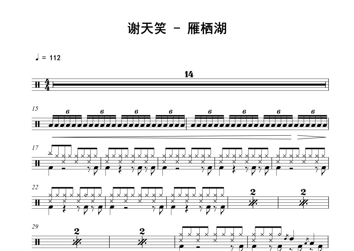 《雁栖湖》是谢天笑演唱的一首歌曲,拍号为4/4拍,歌曲速度为每分钟112拍,这份架子鼓谱共有三张高清图谱,图谱由 @积极处世 编配上传,图谱使用五线谱编配,使用这份雁栖湖架子鼓谱,你将能够轻松地敲打出这首谢天笑的雁栖湖,快来尝试吧。