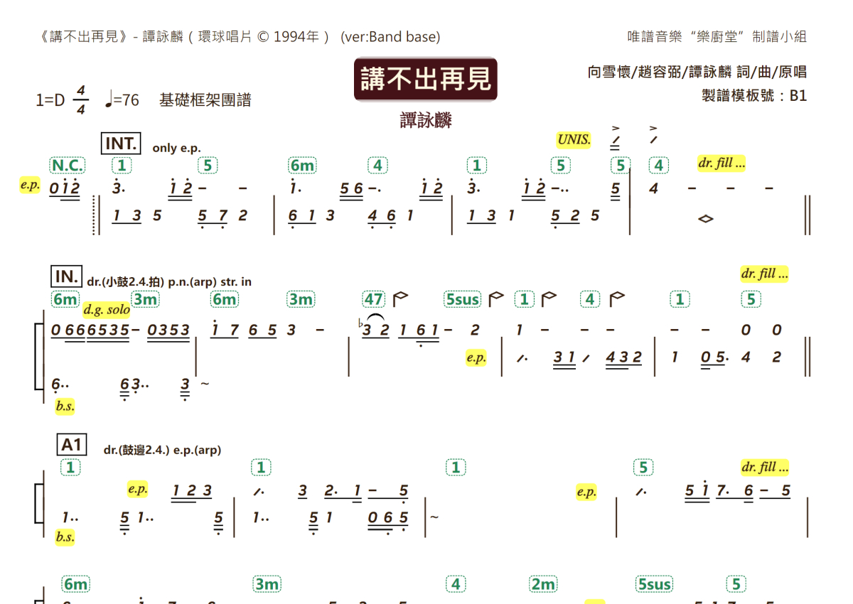 讲不出再见乐队总谱 - 谭咏麟演唱 - 基础框架团谱