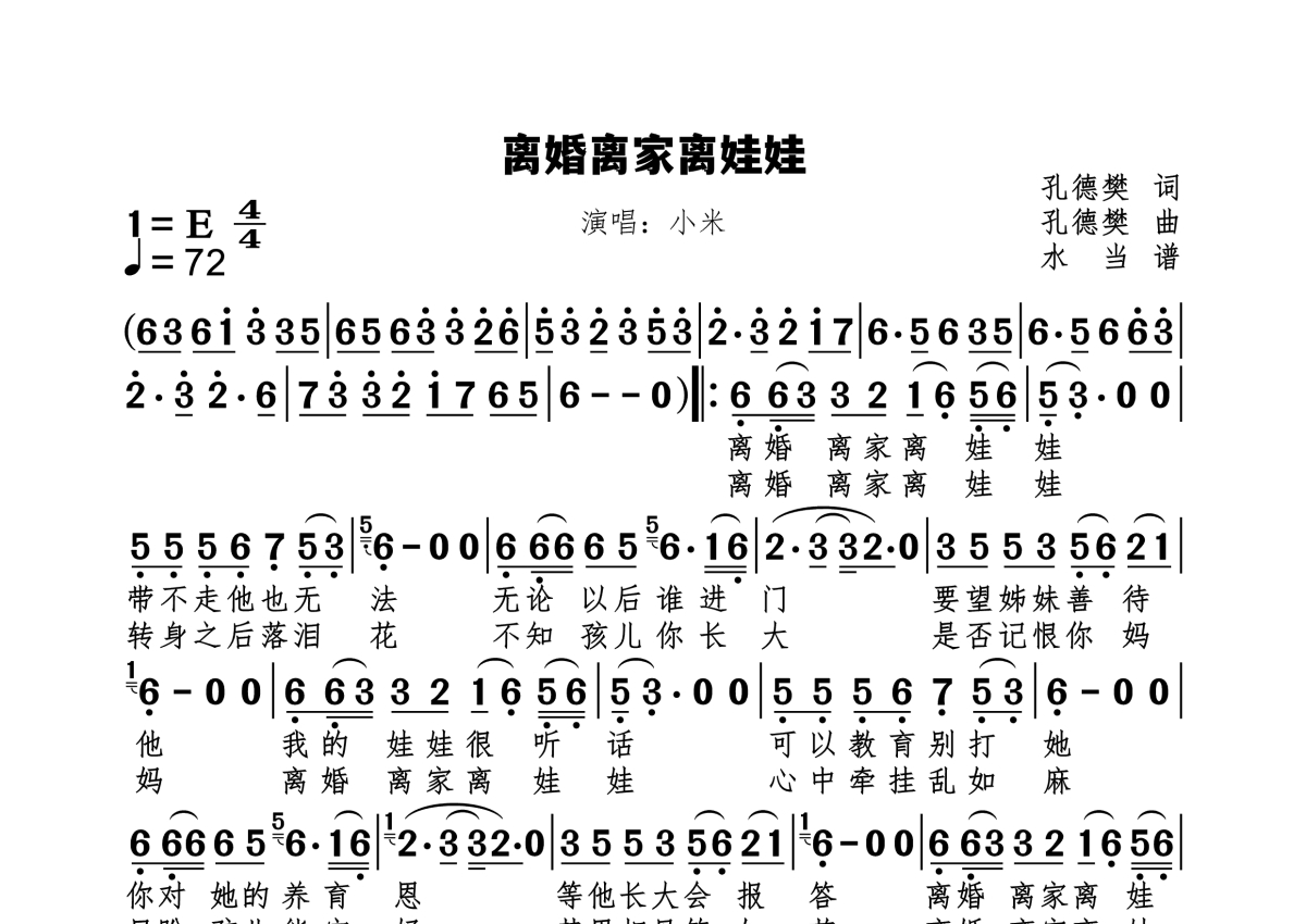 《离婚离家离娃娃》是小米演唱的一首歌曲,拍号为4/4拍,歌曲速度为每分钟72拍,这份简谱共有一张高清图谱,图谱由 @水当 编配上传原调E。
