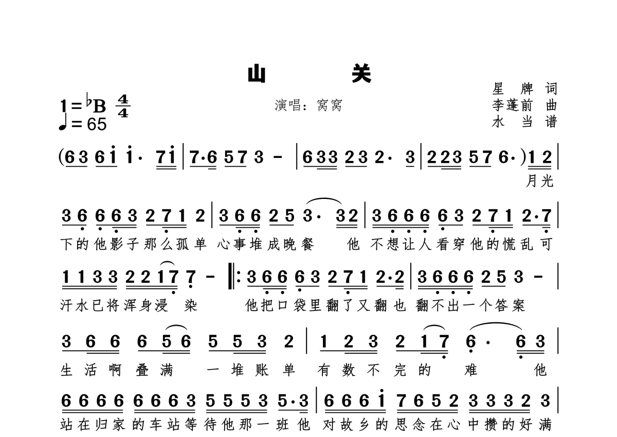 《山关》是窝窝演唱的一首歌曲,拍号为4/4拍,歌曲速度为每分钟65拍,这份简谱共有一张高清图谱,图谱由 @水当 编配上传原调bB。