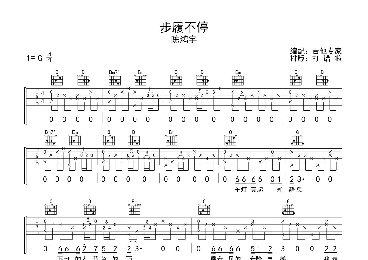 陈鸿宇《步履不停》吉他谱 - G调弹唱六线谱
