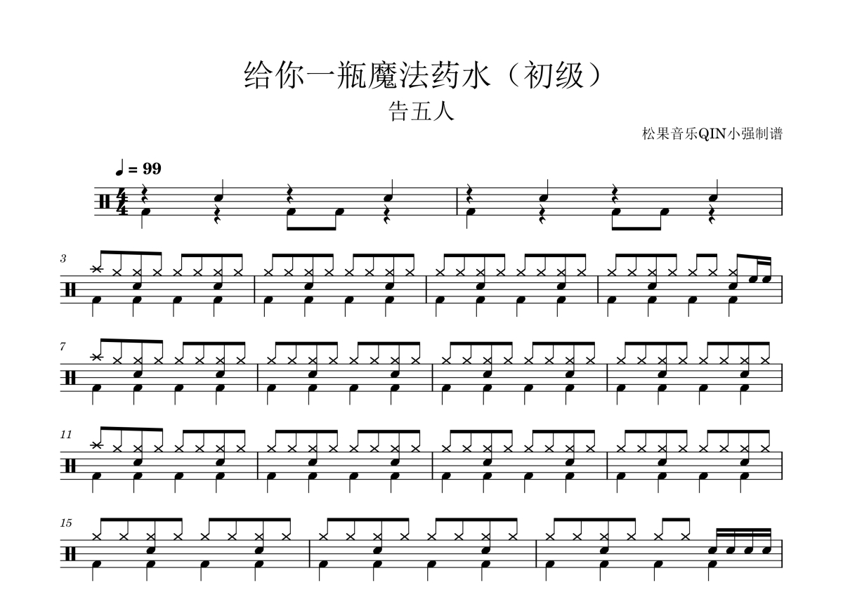 《给你一瓶魔法药水(初级)》是初级演唱的一首歌曲,拍号为4/4拍,这份架子鼓谱共有三张高清图谱,图谱由 @松果音乐QIN小强 编配上传,图谱使用五线谱编配,使用这份给你一瓶魔法药水(初级)架子鼓谱,你将能够轻松地敲打出这首初级的给你一瓶魔法药水(初级),快来尝试吧。《给你一瓶魔法药水》是告五人演唱的一首歌曲,告五人、云安作词、作曲,告五人编曲,陈君豪制作 [1],于2022年7月4日由银河方舟公司发行,收录于专辑《玫瑰凭证》中。