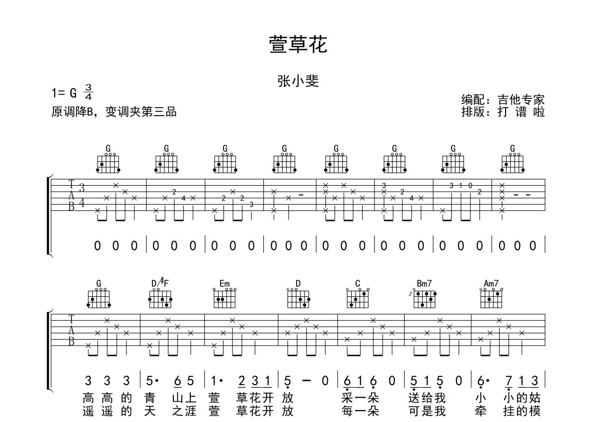 《萱草花》是张小斐演唱的一首歌曲,本吉他谱采用的是G调指法编配,这份吉他谱共有两张高清图谱,图谱由 @吉他专家 编配上传,图谱使用六线谱编配,包含吉他和弦指法、简谱以及歌词部分,使用这份萱草花吉他谱,可以让你更加方便地掌握这首歌曲的弹唱技巧,快来尝试吧。张小斐《萱草花》吉他谱_G调吉他弹唱谱。
