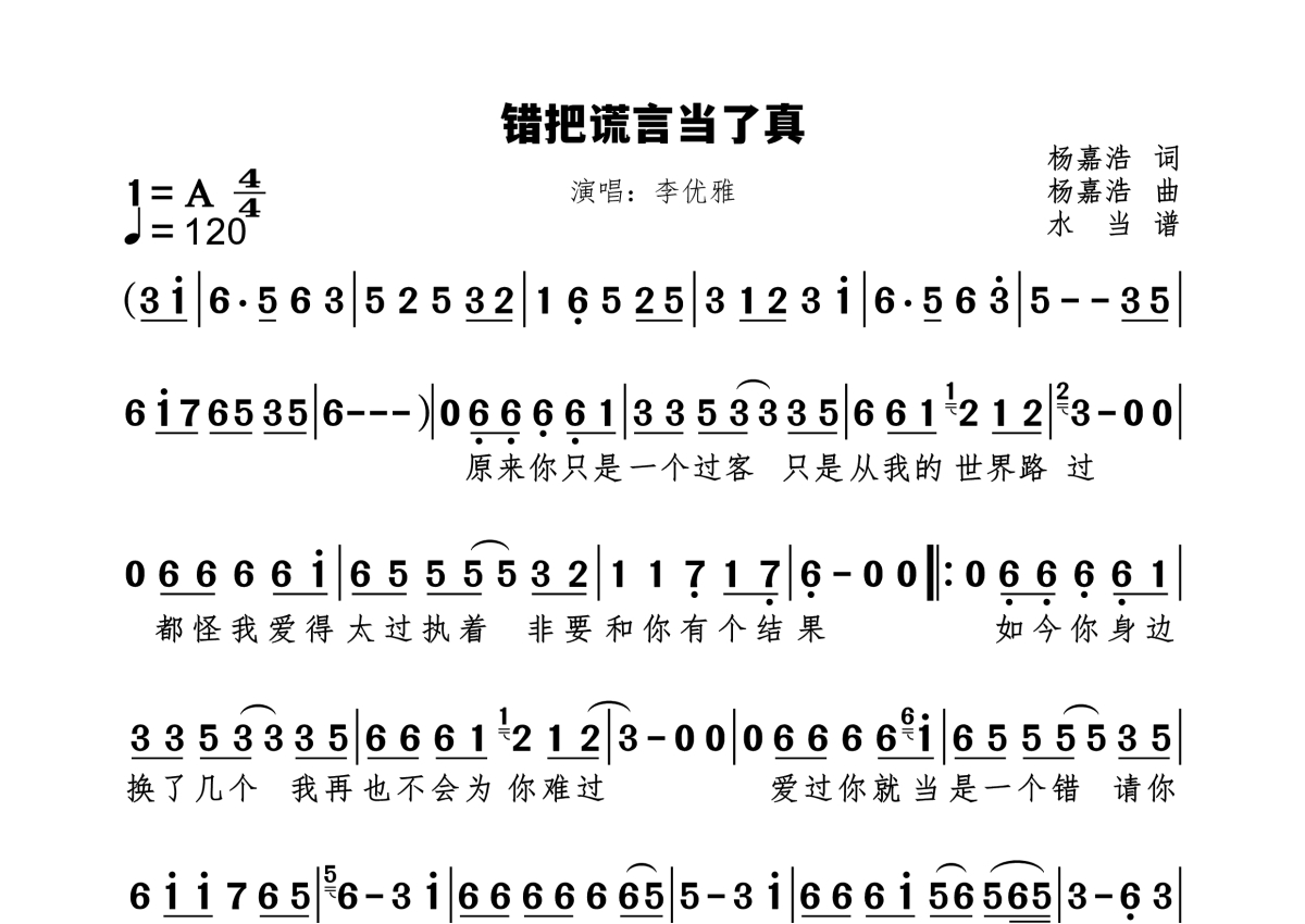 《错把谎言当了真》是李优雅演唱的一首歌曲,拍号为4/4拍,歌曲速度为每分钟120拍,这份简谱共有一张高清图谱,图谱由 @水当 编配上传原调A。