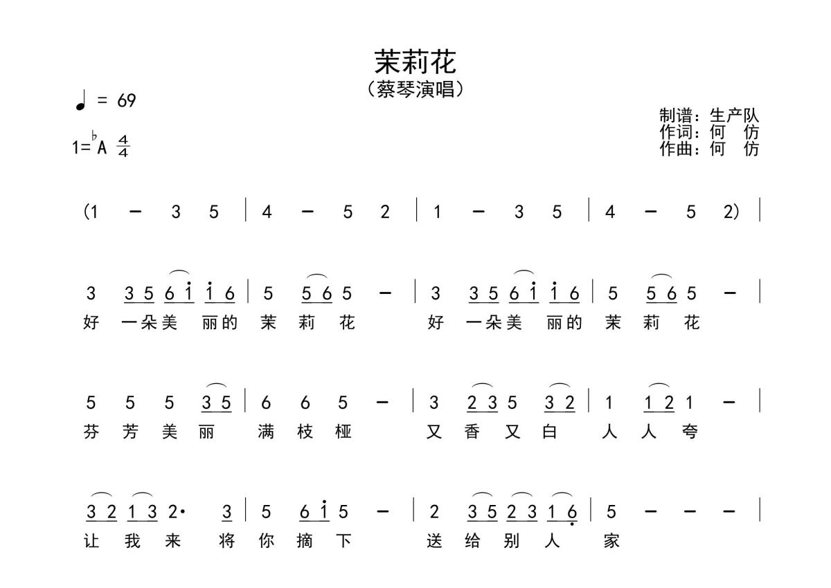 《茉莉花》是蔡琴演唱的一首歌曲,原版简谱,拍号为4/4拍,歌曲速度为每分钟69拍,这份简谱共有一张高清图谱,图谱由 @生产队 编配上传蔡琴演唱的歌曲《茉莉花》原版简谱,含前奏、间奏编配,精编完美版,怀旧经典!。