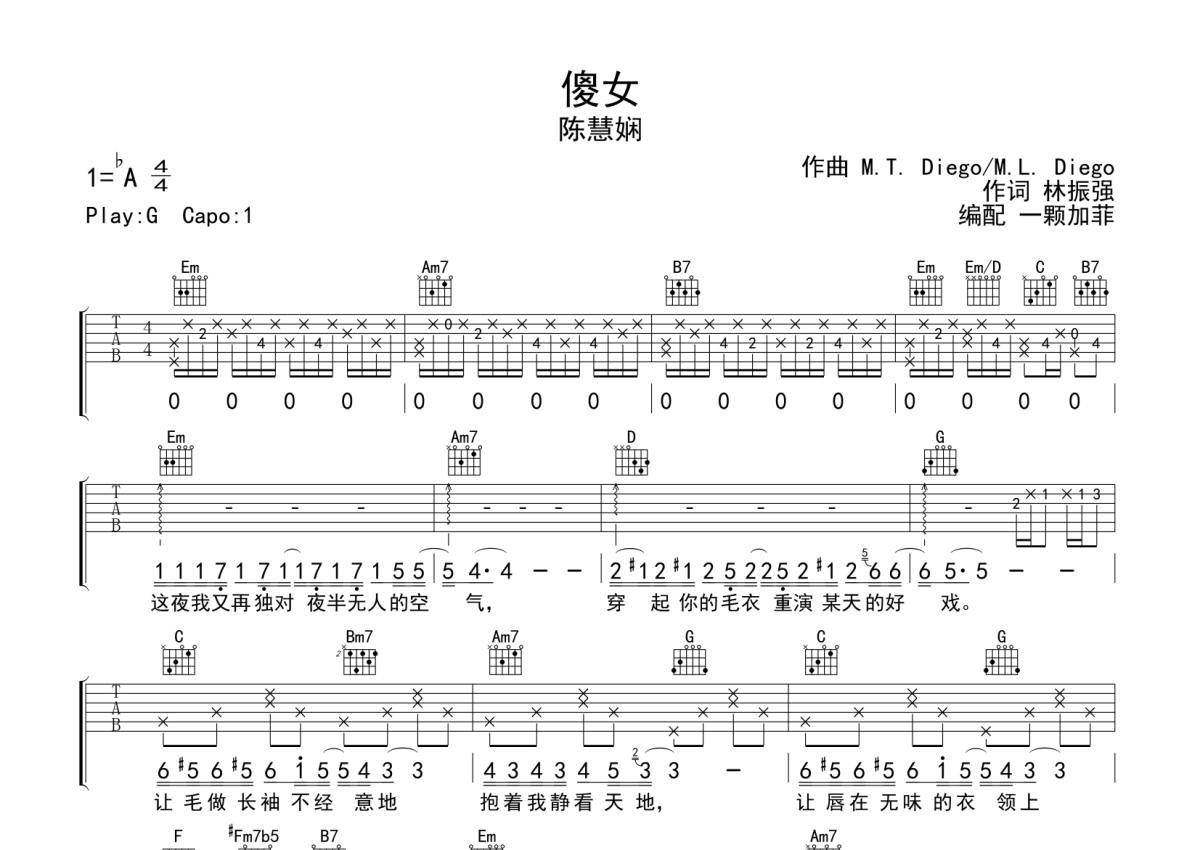 《傻女》是陈慧娴演唱的一首歌曲,本吉他谱采用的是G调指法编配,这份吉他谱共有两张高清图谱,图谱由 @一颗加菲 编配上传,图谱使用六线谱编配,包含吉他和弦指法、简谱以及歌词部分,曲谱配备了相关的音频提供试听,使用这份傻女吉他谱,可以让你更加方便地掌握这首歌曲的弹唱技巧,快来尝试吧。