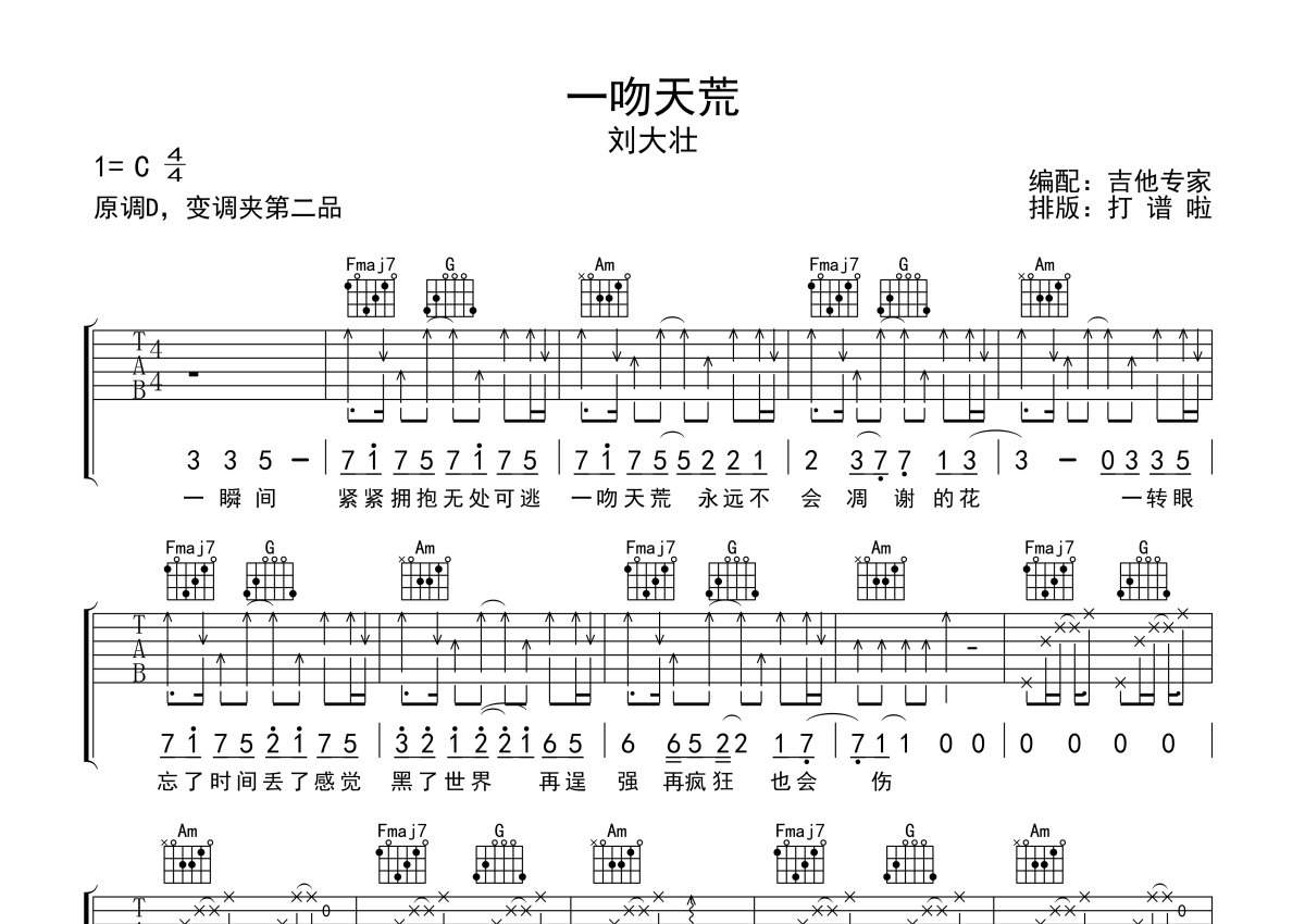 刘大壮《一吻天荒》吉他谱 - C调弹唱六线谱