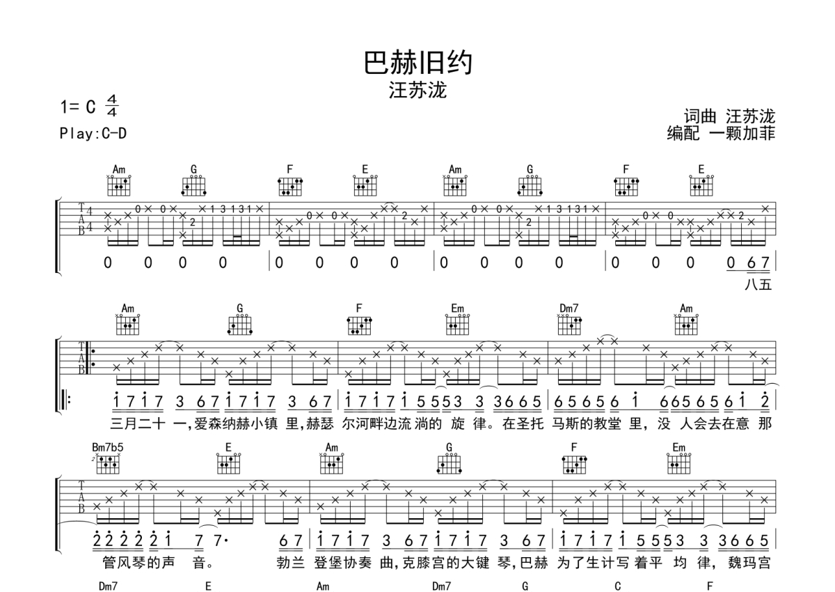 巴赫旧约吉他谱 - 汪苏泷演唱 - C调弹唱六线谱
