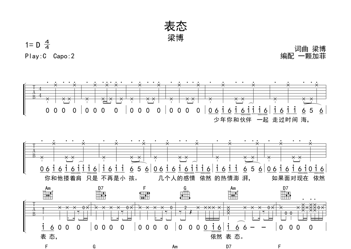 《表态》是梁博演唱的一首歌曲,本吉他谱采用的是C调指法编配,这份吉他谱共有三张高清图谱,图谱由 @一颗加菲 编配上传,图谱使用六线谱编配,包含吉他和弦指法、简谱以及歌词部分,曲谱配备了相关的音频提供试听,使用这份表态吉他谱,可以让你更加方便地掌握这首歌曲的弹唱技巧,快来尝试吧。