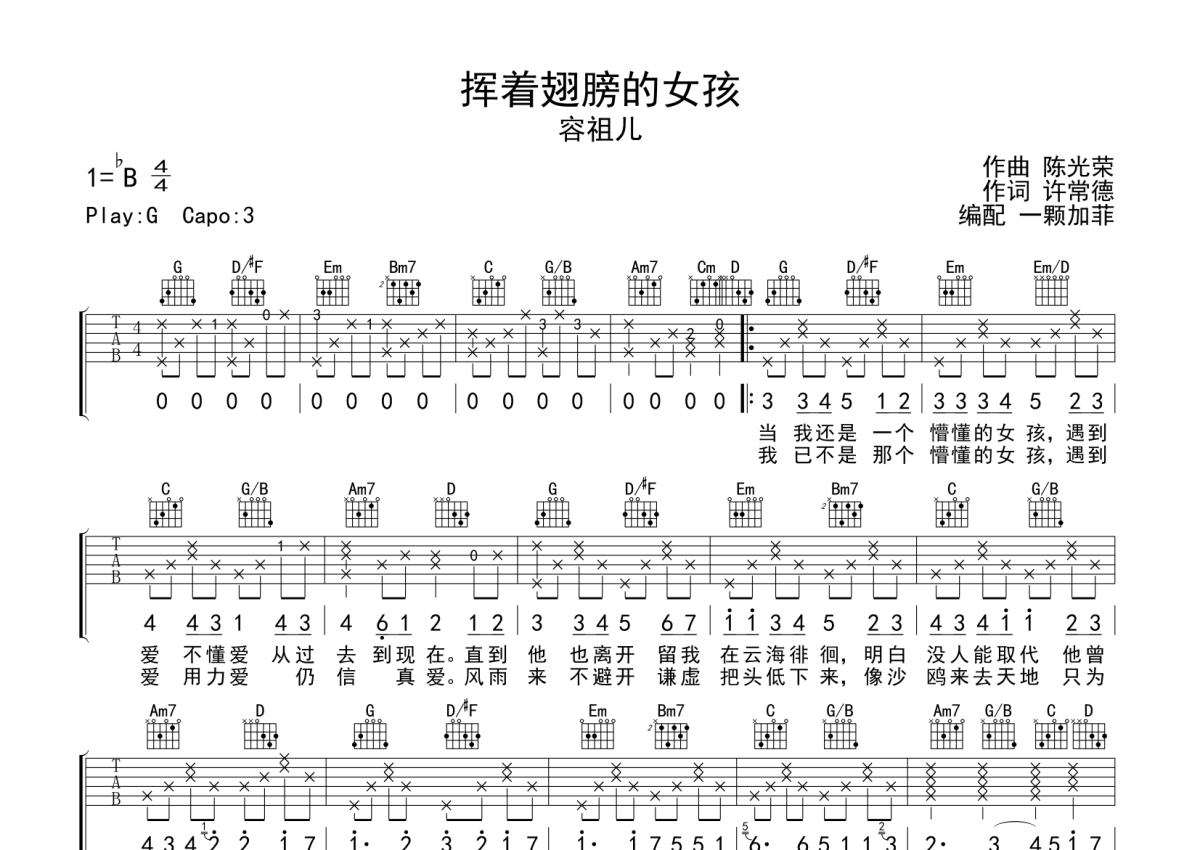 《挥着翅膀的女孩》是容祖儿演唱的一首歌曲,本吉他谱采用的是G调指法编配,这份吉他谱共有两张高清图谱,图谱由 @一颗加菲 编配上传,图谱使用六线谱编配,包含吉他和弦指法、简谱以及歌词部分,曲谱配备了相关的音频提供试听,使用这份挥着翅膀的女孩吉他谱,可以让你更加方便地掌握这首歌曲的弹唱技巧,快来尝试吧。