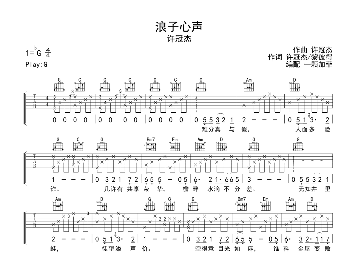 浪子心声吉他谱 - 许冠杰演唱 - G调弹唱六线谱