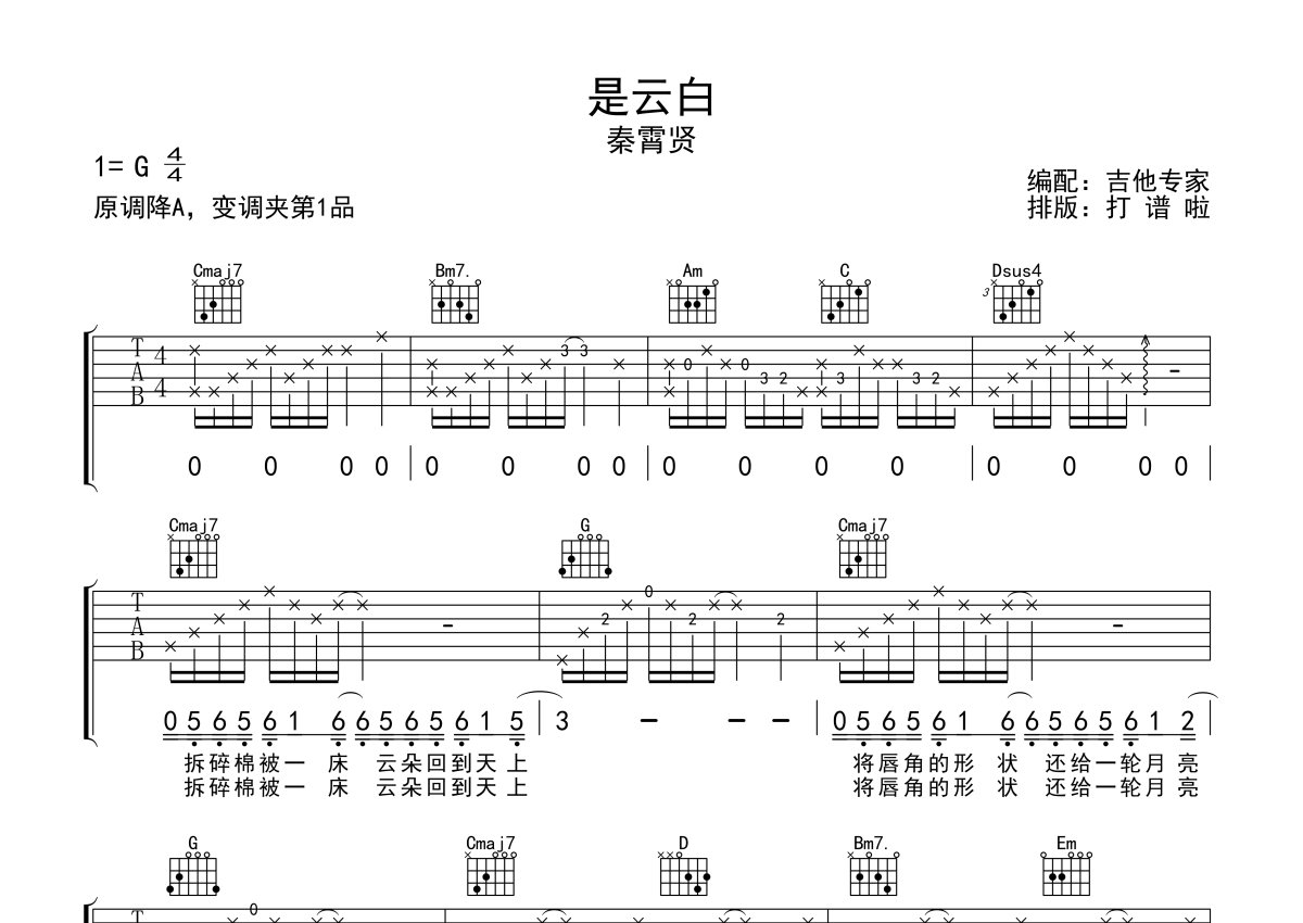 《是云白》是秦霄贤演唱的一首歌曲,本吉他谱采用的是G调指法编配,这份吉他谱共有两张高清图谱,图谱由 @吉他专家 编配上传,图谱使用六线谱编配,包含吉他和弦指法、简谱以及歌词部分,使用这份是云白吉他谱,可以让你更加方便地掌握这首歌曲的弹唱技巧,快来尝试吧。 秦霄贤首支个人数字单曲《是云白》,3月12日,由德云社知名相声演员秦霄贤演唱的电影《白蛇情劫》主题曲《是云白》在网易云音乐平台独家上线,因为是试听也要收费,所以我们这就不把歌曲分享到微信公众号里面了,老秦不厚道呀,不过歌曲还可以!。
