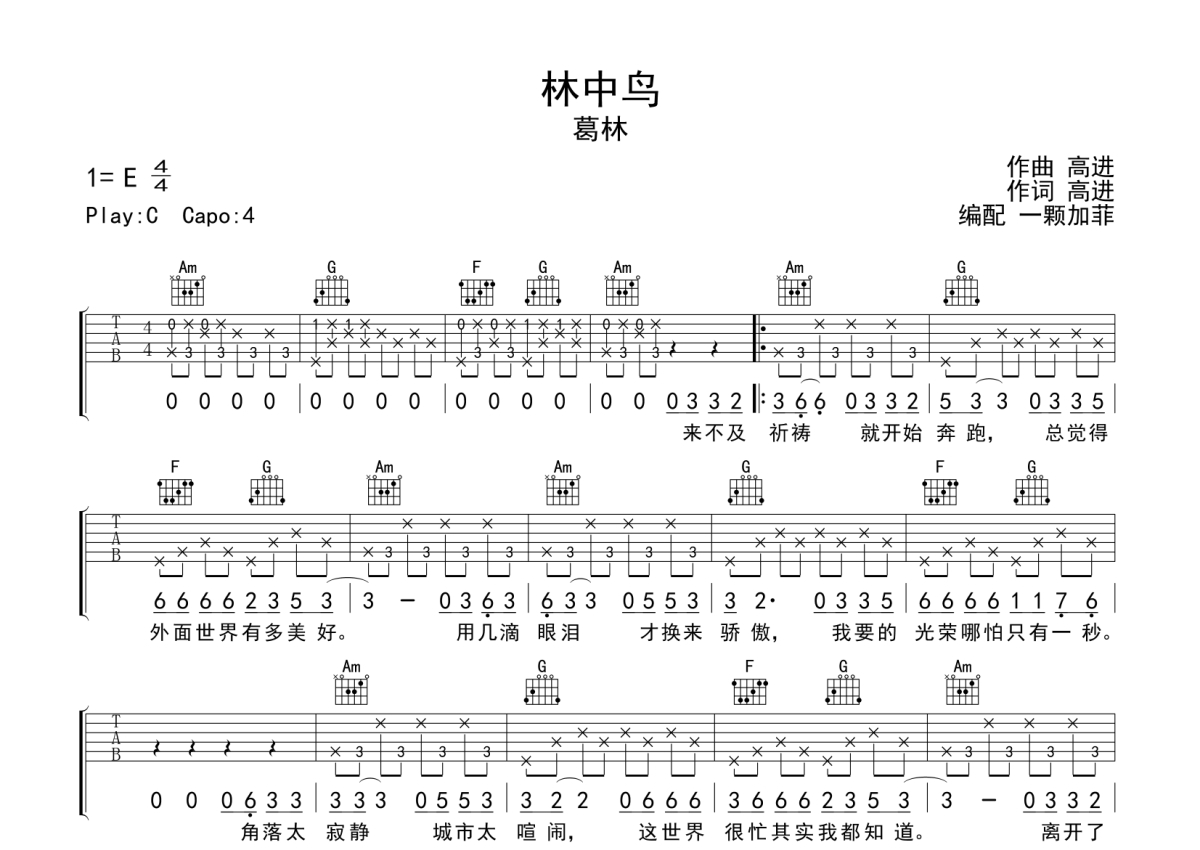林中鸟吉他谱 - 葛林演唱 - C调弹唱六线谱