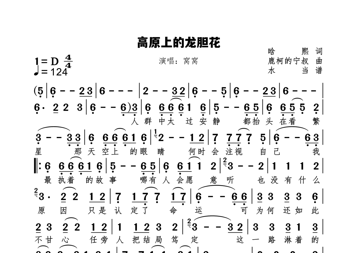 《高原上的龙胆花》是窝窝演唱的一首歌曲,拍号为4/4拍,歌曲速度为每分钟124拍,这份简谱共有一张高清图谱,图谱由 @水当 编配上传原调D。