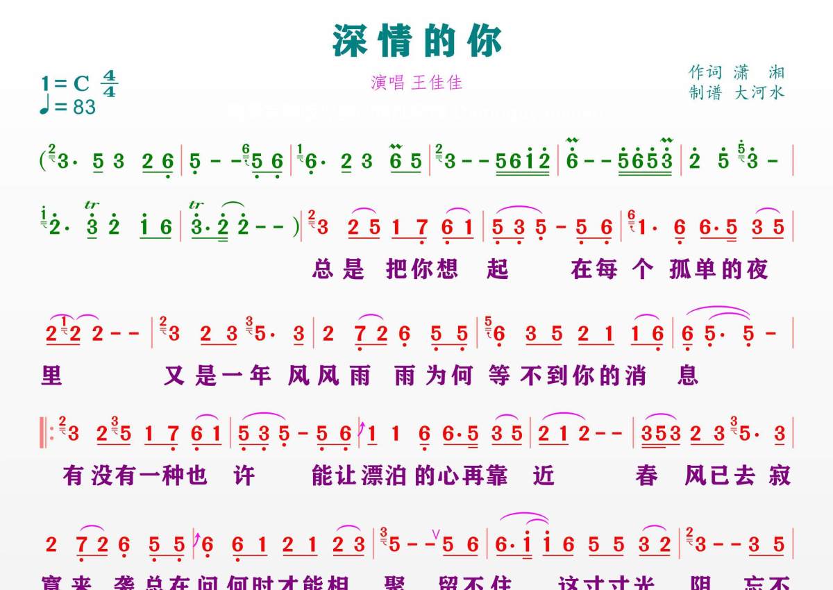 《深情的你》是王佳佳演唱的一首歌曲,拍号为4/4拍,歌曲速度为每分钟83拍,这份简谱共有一张高清图谱,图谱由 @临海雪原 编配上传。