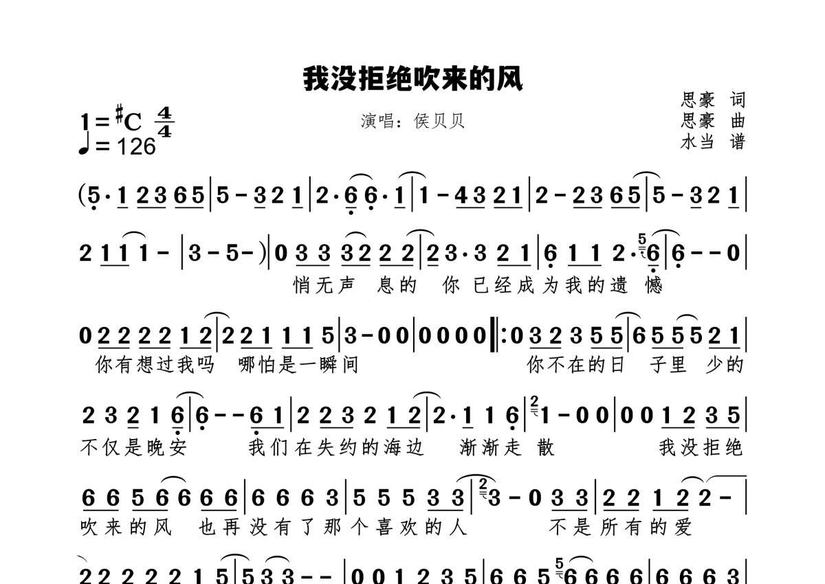 《我没拒绝吹来的风》是侯贝贝演唱的一首歌曲,拍号为4/4拍,歌曲速度为每分钟126拍,这份简谱共有一张高清图谱,图谱由 @水当 编配上传原调#C。