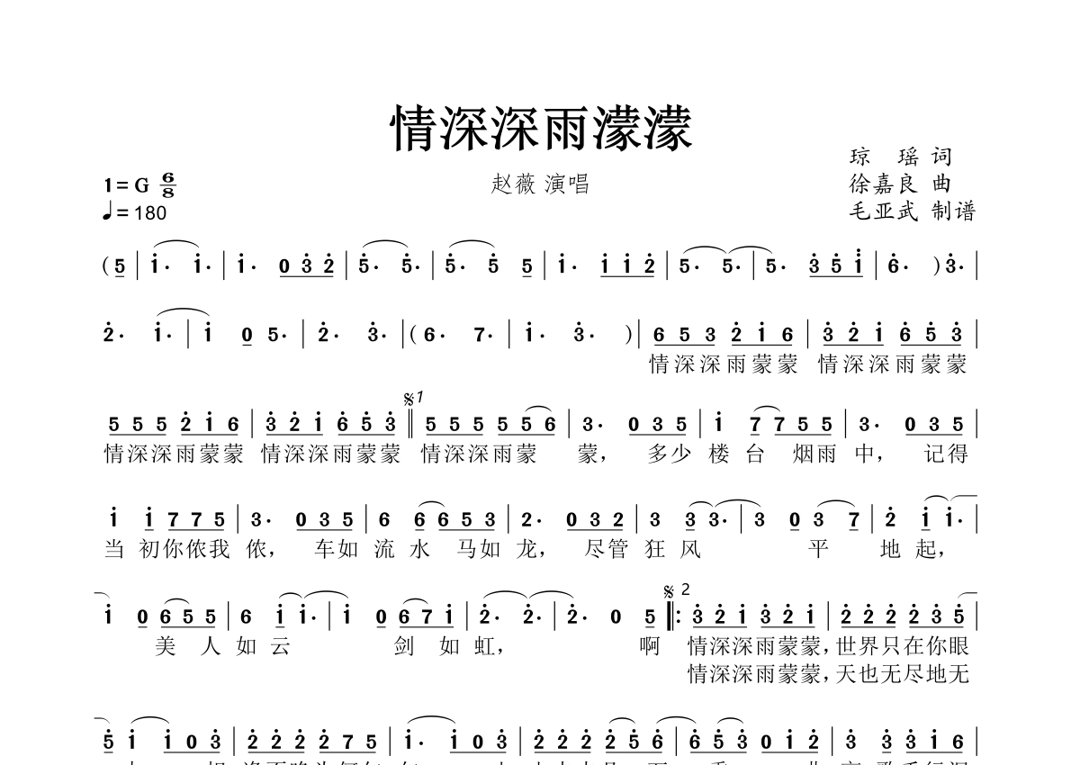《情深深雨濛濛》是赵薇演唱的一首歌曲,拍号为6/8拍,这份简谱共有一张高清图谱,图谱由 @秋天的童话 编配上传。