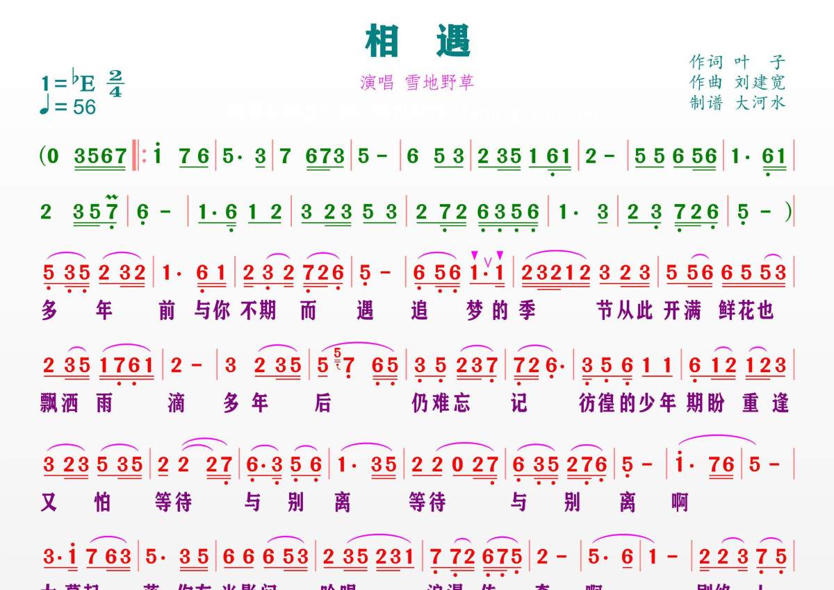 《相遇》是雪地野草演唱的一首歌曲,拍号为2/4拍,歌曲速度为每分钟56拍,这份简谱共有一张高清图谱,图谱由 @临海雪原 编配上传。