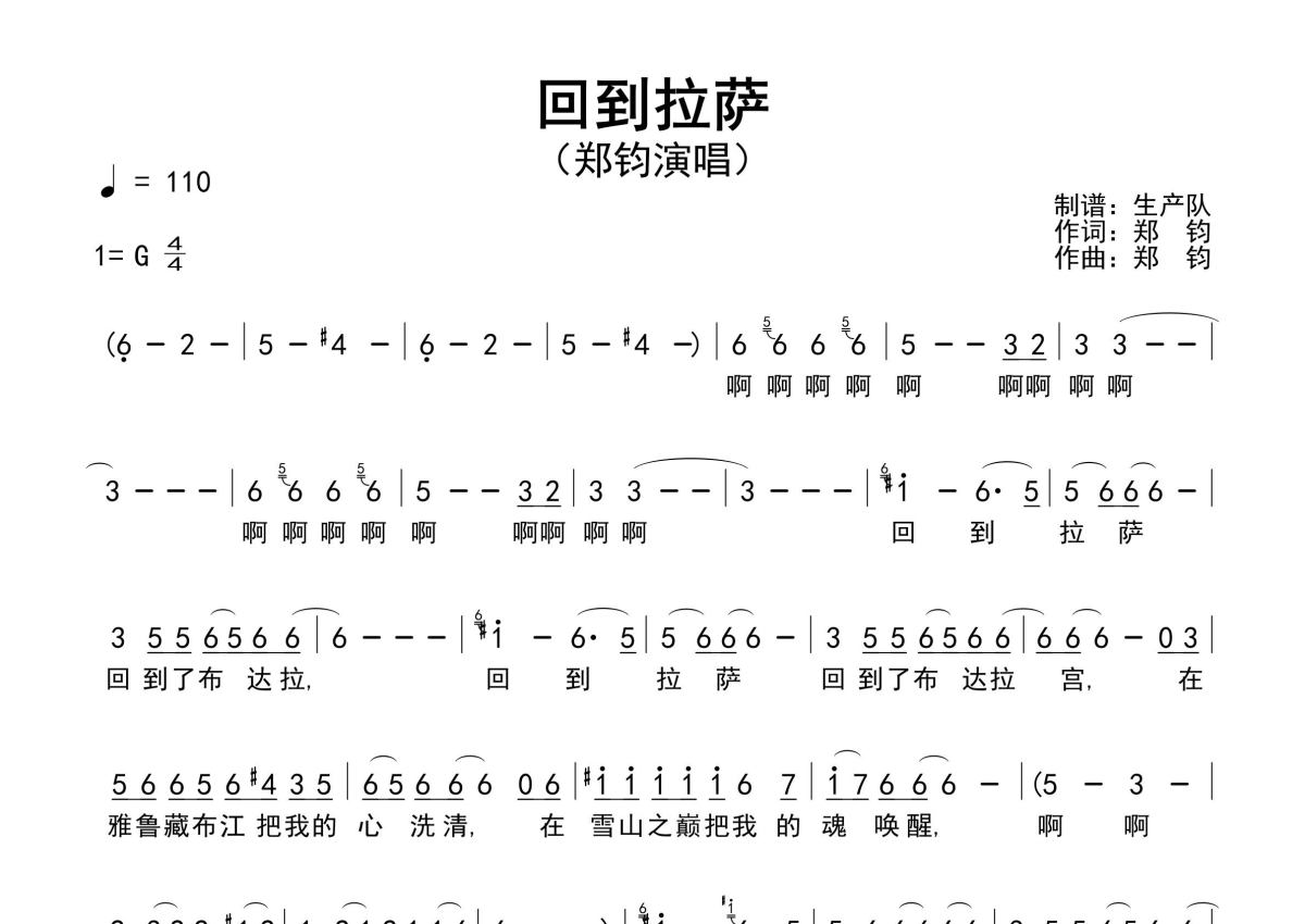 《回到拉萨》是郑钧演唱的一首歌曲,原版简谱,拍号为4/4拍,歌曲速度为每分钟110拍,这份简谱共有两张高清图谱,图谱由 @生产队 编配上传郑钧作词、作曲并演唱的经典歌曲《回到拉萨》原版简谱,含前奏、间奏、尾奏solo编配,精编完美版,致敬经典!。