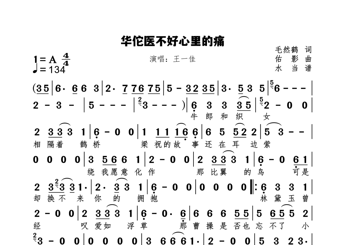 《华佗医不好心里的痛》是王一佳演唱的一首歌曲,拍号为4/4拍,歌曲速度为每分钟134拍,这份简谱共有一张高清图谱,图谱由 @水当 编配上传原调A。