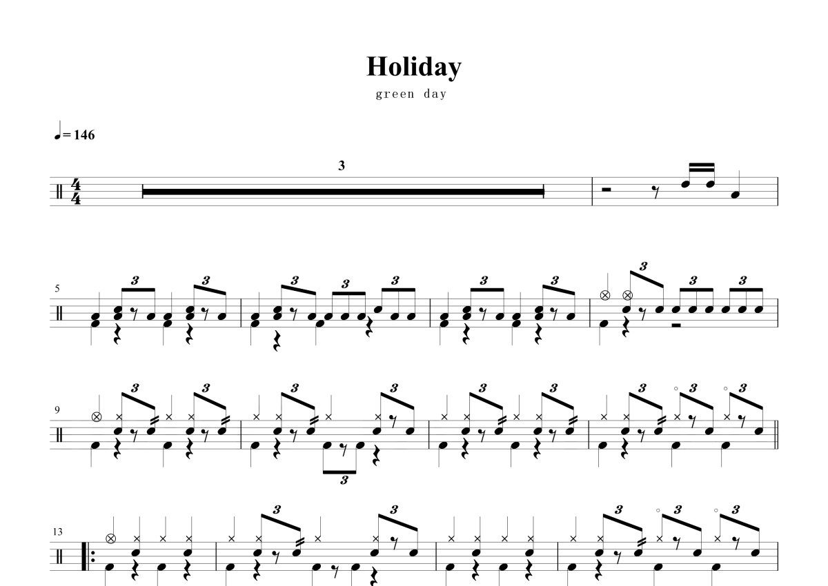 《Holiday》是Green Day演唱的一首歌曲,拍号为4/4拍,歌曲速度为每分钟146拍,这份架子鼓谱共有三张高清图谱,图谱由 @音符喷血者 编配上传,图谱使用五线谱编配,使用这份Holiday架子鼓谱,你将能够轻松地敲打出这首Green Day的Holiday,快来尝试吧。
