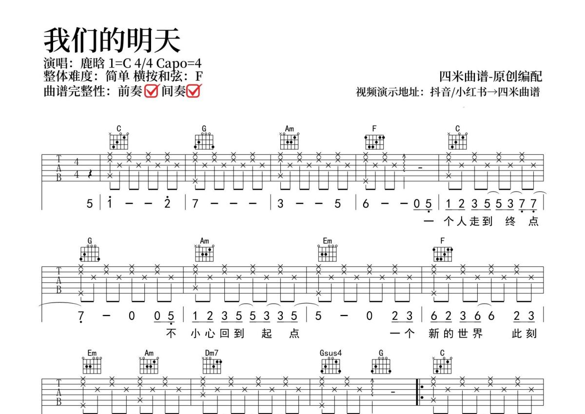 我们的明天吉他谱 - 鹿晗演唱 - C调弹唱六线谱