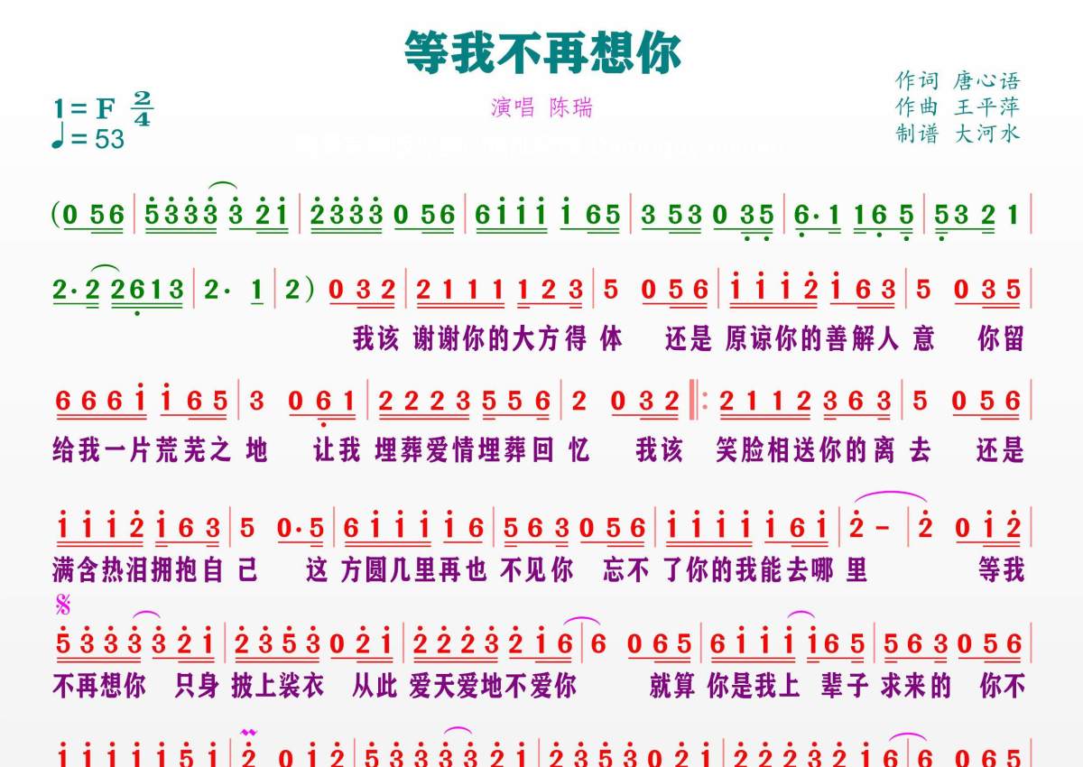 《等我不再想你》是陈瑞演唱的一首歌曲,拍号为2/4拍,歌曲速度为每分钟53拍,这份简谱共有一张高清图谱,图谱由 @临海雪原 编配上传。