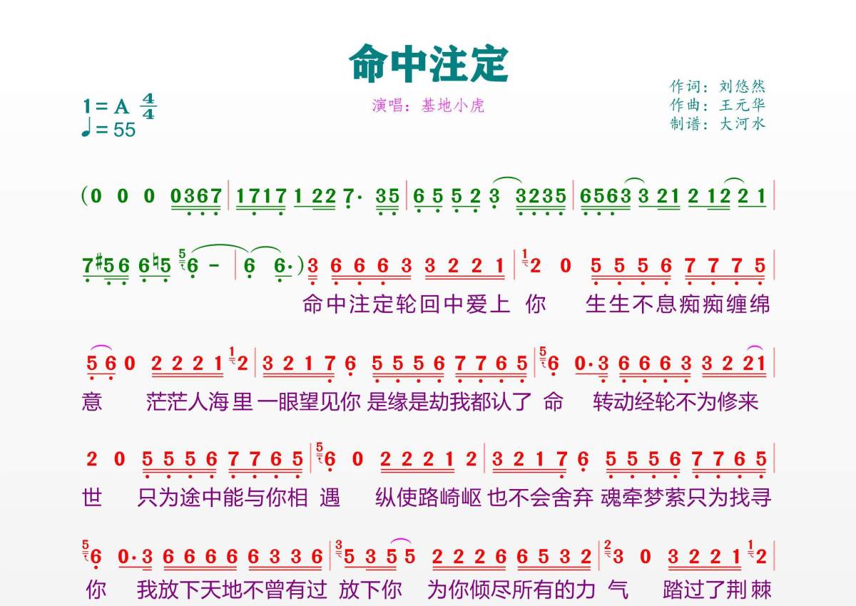 《命中注定》是基地小虎演唱的一首歌曲,拍号为4/4拍,歌曲速度为每分钟55拍,这份简谱共有两张高清图谱,图谱由 @临海雪原 编配上传。