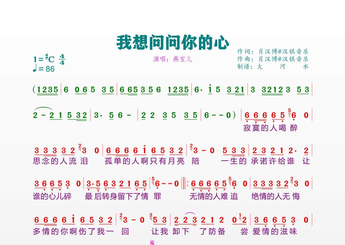 《我想问问你的心》是燕宝儿演唱的一首歌曲,拍号为4/4拍,歌曲速度为每分钟86拍,这份简谱共有一张高清图谱,图谱由 @临海雪原 编配上传。