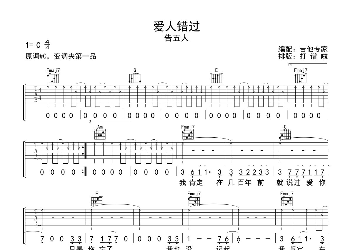 告五人《爱人错过》吉他谱 - C调弹唱六线谱