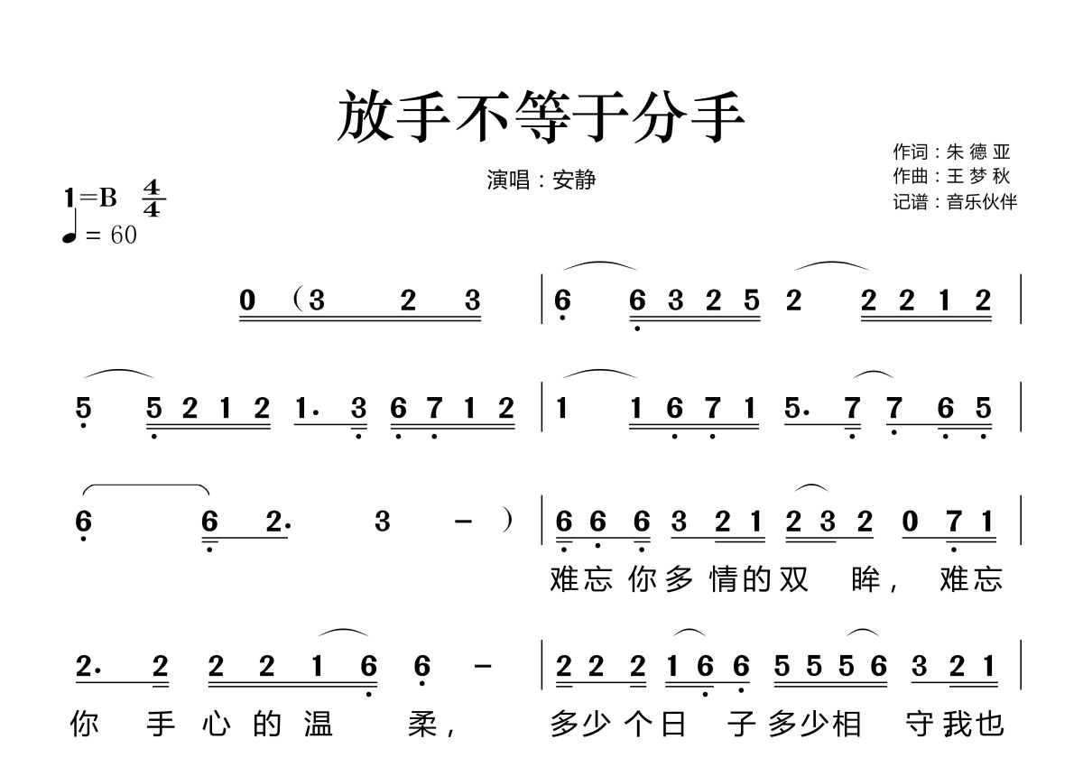 《放手不等于分手》是安静演唱的一首歌曲,拍号为4/4拍,歌曲速度为每分钟60拍,这份简谱共有两张高清图谱,图谱由 @音乐伙伴 编配上传。