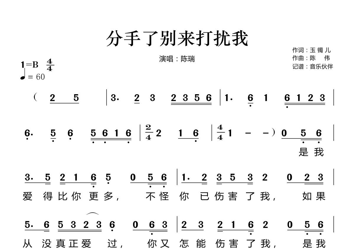 《分手了别来打扰我》是陈瑞演唱的一首歌曲,拍号为4/4拍,歌曲速度为每分钟60拍,这份简谱共有两张高清图谱,图谱由 @音乐伙伴 编配上传。