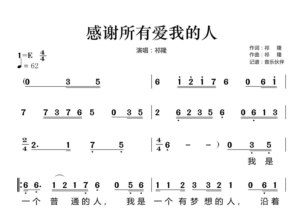 《感谢所有爱我的人》是祁隆演唱的一首歌曲,拍号为4/4拍,歌曲速度为每分钟62拍,这份简谱共有三张高清图谱,图谱由 @音乐伙伴 编配上传。