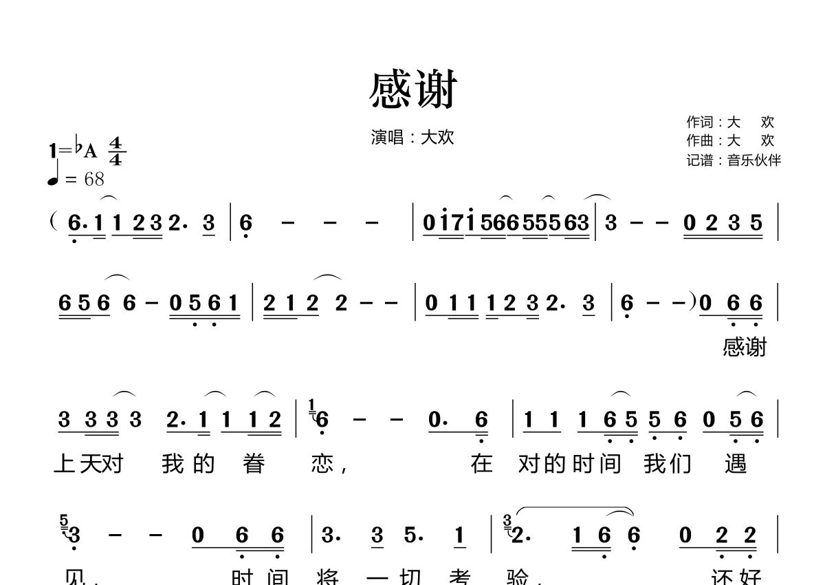 感谢简谱 - 大欢演唱