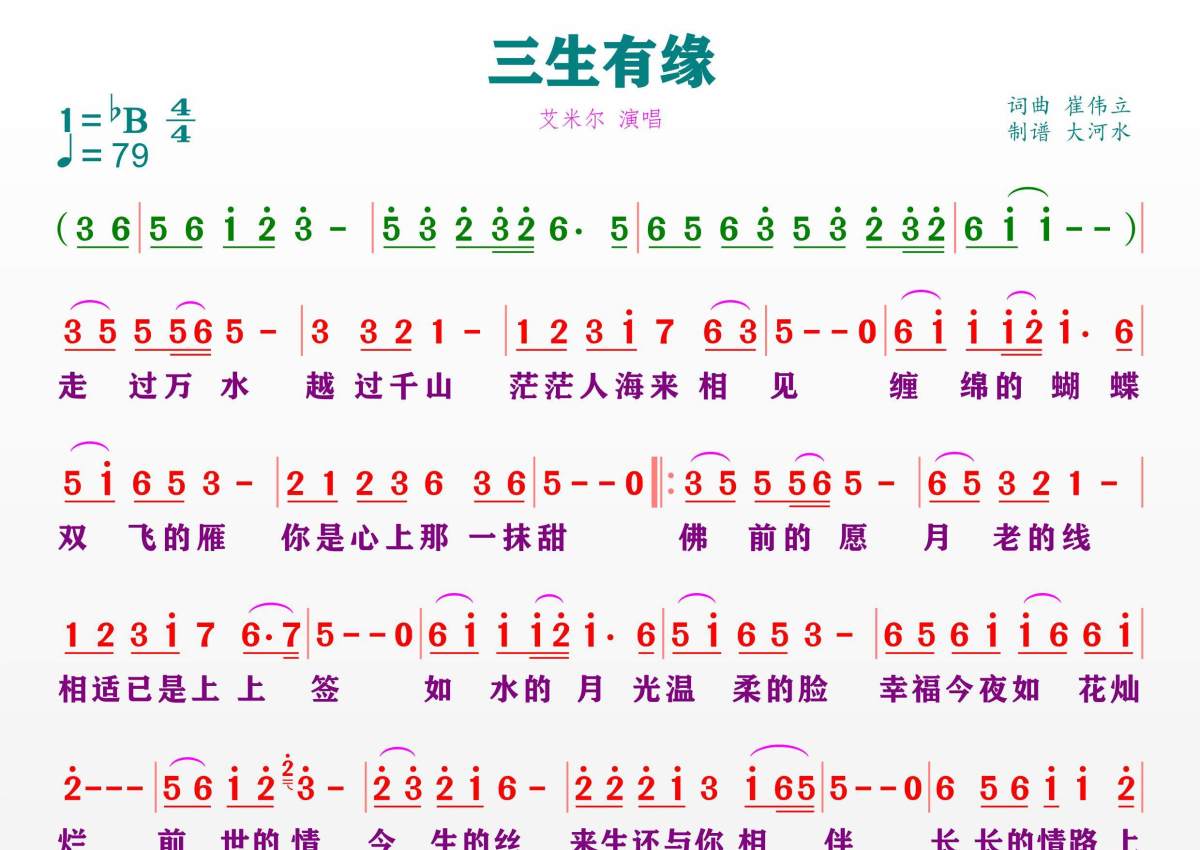 《三生有缘》是艾米尔演唱的一首歌曲,拍号为4/4拍,歌曲速度为每分钟79拍,这份简谱共有一张高清图谱,图谱由 @临海雪原 编配上传。