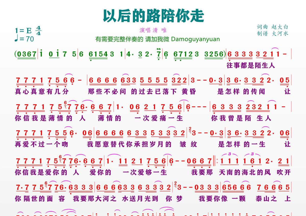 《以后的路陪你走》是清唯演唱的一首歌曲,拍号为4/4拍,歌曲速度为每分钟70拍,这份简谱共有一张高清图谱,图谱由 @临海雪原 编配上传。
