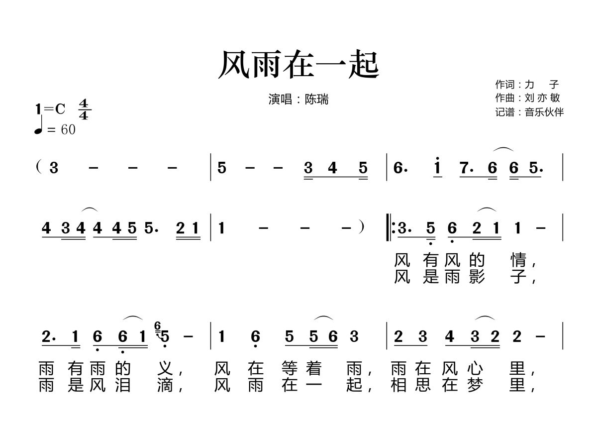 《风雨在一起》是陈瑞演唱的一首歌曲,拍号为4/4拍,歌曲速度为每分钟60拍,这份简谱共有两张高清图谱,图谱由 @音乐伙伴 编配上传。