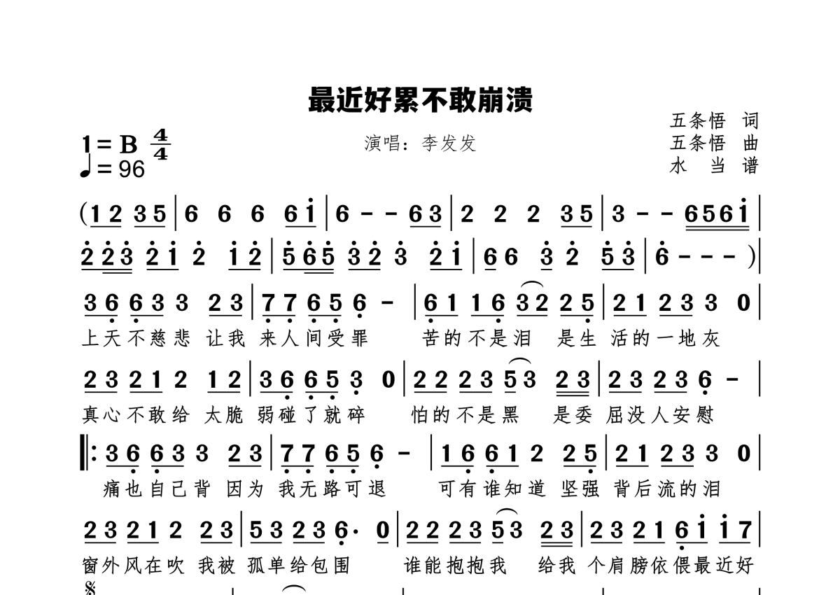《最近好累不敢崩溃》是李发发演唱的一首歌曲,拍号为4/4拍,歌曲速度为每分钟96拍,这份简谱共有一张高清图谱,图谱由 @水当 编配上传原调B。