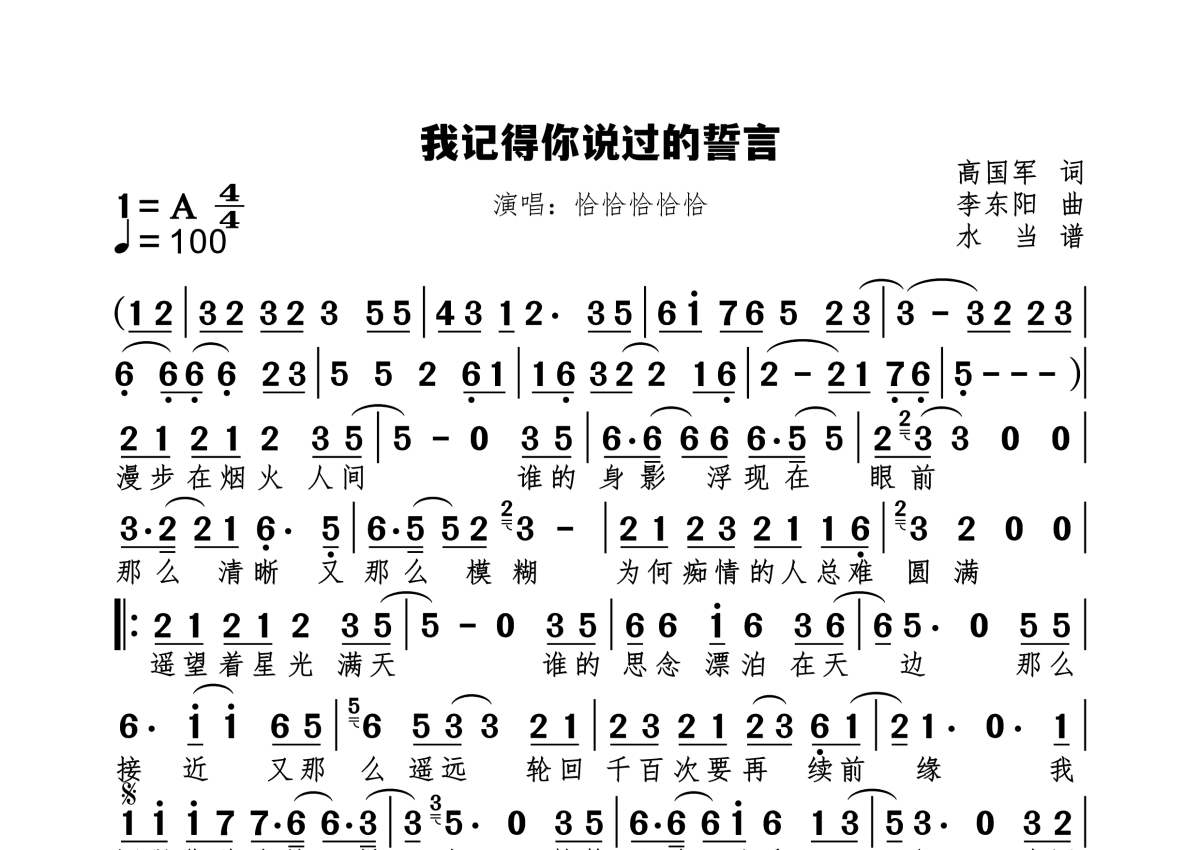 《我记得你说过的誓言》是恰恰恰恰恰演唱的一首歌曲,拍号为4/4拍,歌曲速度为每分钟100拍,这份简谱共有一张高清图谱,图谱由 @水当 编配上传原调A。