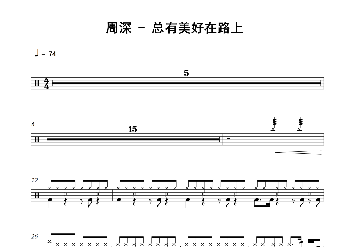 《总有美好在路上》是周深演唱的一首歌曲,拍号为4/4拍,歌曲速度为每分钟74拍,这份架子鼓谱共有两张高清图谱,图谱由 @失眠的土豆 编配上传,图谱使用五线谱编配,使用这份总有美好在路上架子鼓谱,你将能够轻松地敲打出这首周深的总有美好在路上,快来尝试吧。