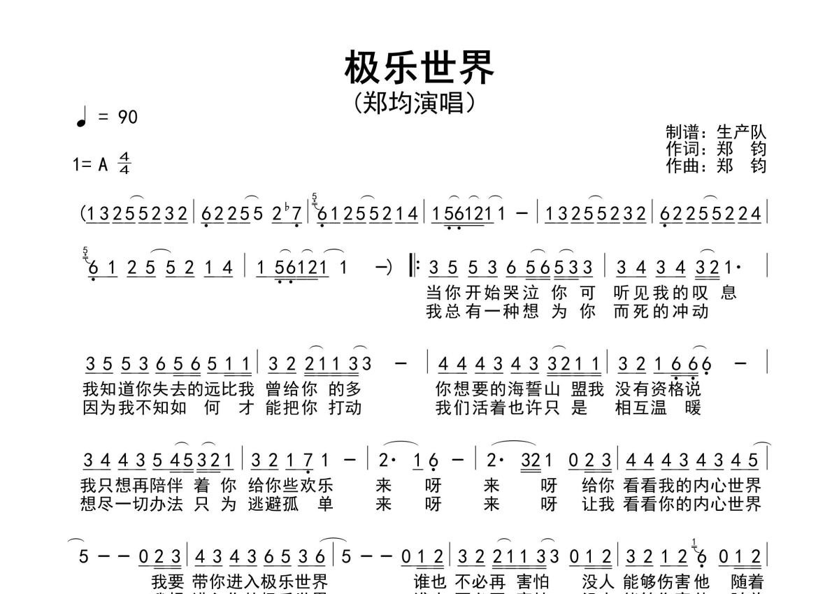 《极乐世界》是郑钧演唱的一首歌曲,原版简谱,拍号为4/4拍,歌曲速度为每分钟90拍,这份简谱共有一张高清图谱,图谱由 @生产队 编配上传郑钧作词、作曲并演唱的歌曲《极乐世界》原版简谱,含前奏、间奏、尾奏solo编配,精编完美版,怀旧经典!。