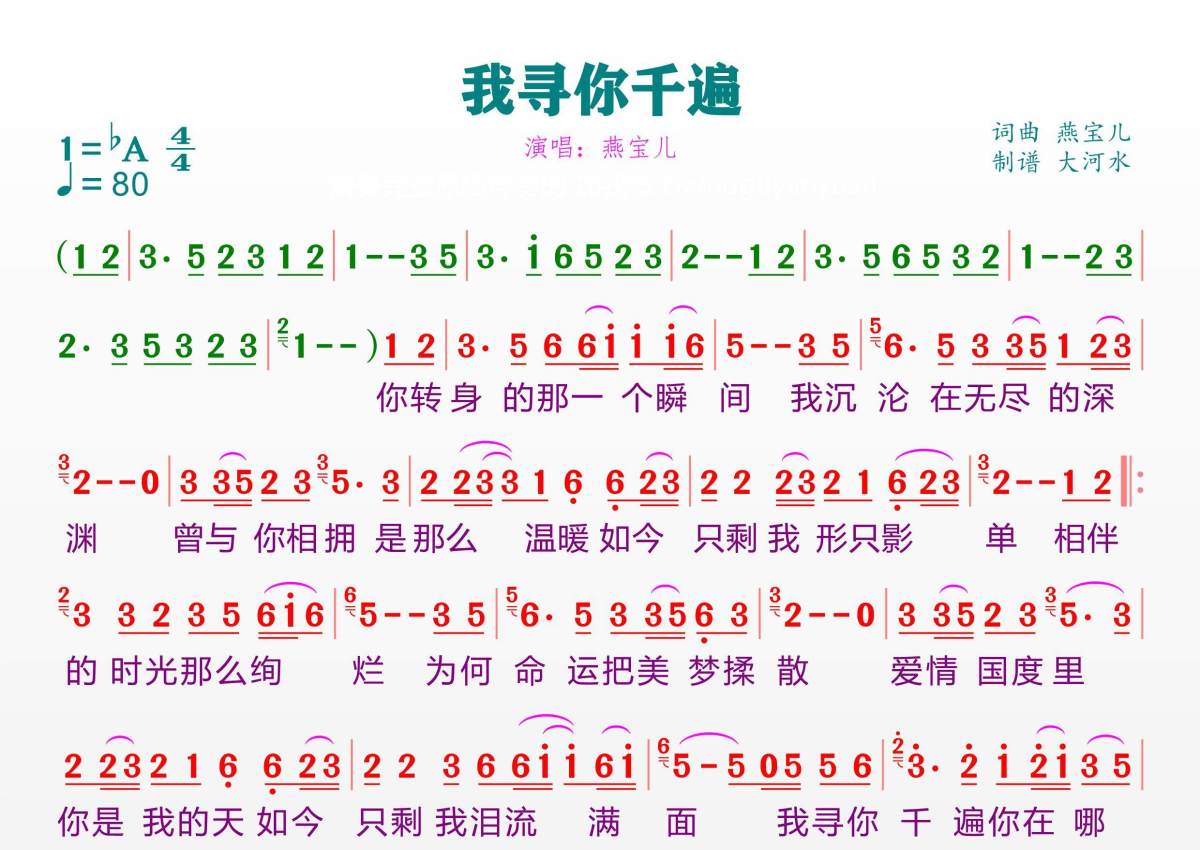 《我寻你千遍》是燕宝儿演唱的一首歌曲,拍号为4/4拍,歌曲速度为每分钟80拍,这份简谱共有一张高清图谱,图谱由 @临海雪原 编配上传。