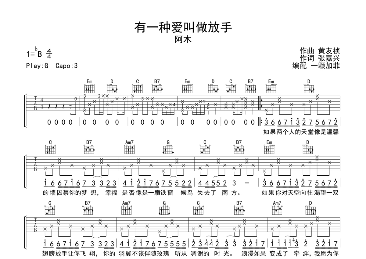 《有一种爱叫做放手》是阿木演唱的一首歌曲,本吉他谱采用的是G调指法编配,这份吉他谱共有两张高清图谱,图谱由 @一颗加菲 编配上传,图谱使用六线谱编配,包含吉他和弦指法、简谱以及歌词部分,曲谱配备了相关的音频提供试听,使用这份有一种爱叫做放手吉他谱,可以让你更加方便地掌握这首歌曲的弹唱技巧,快来尝试吧。