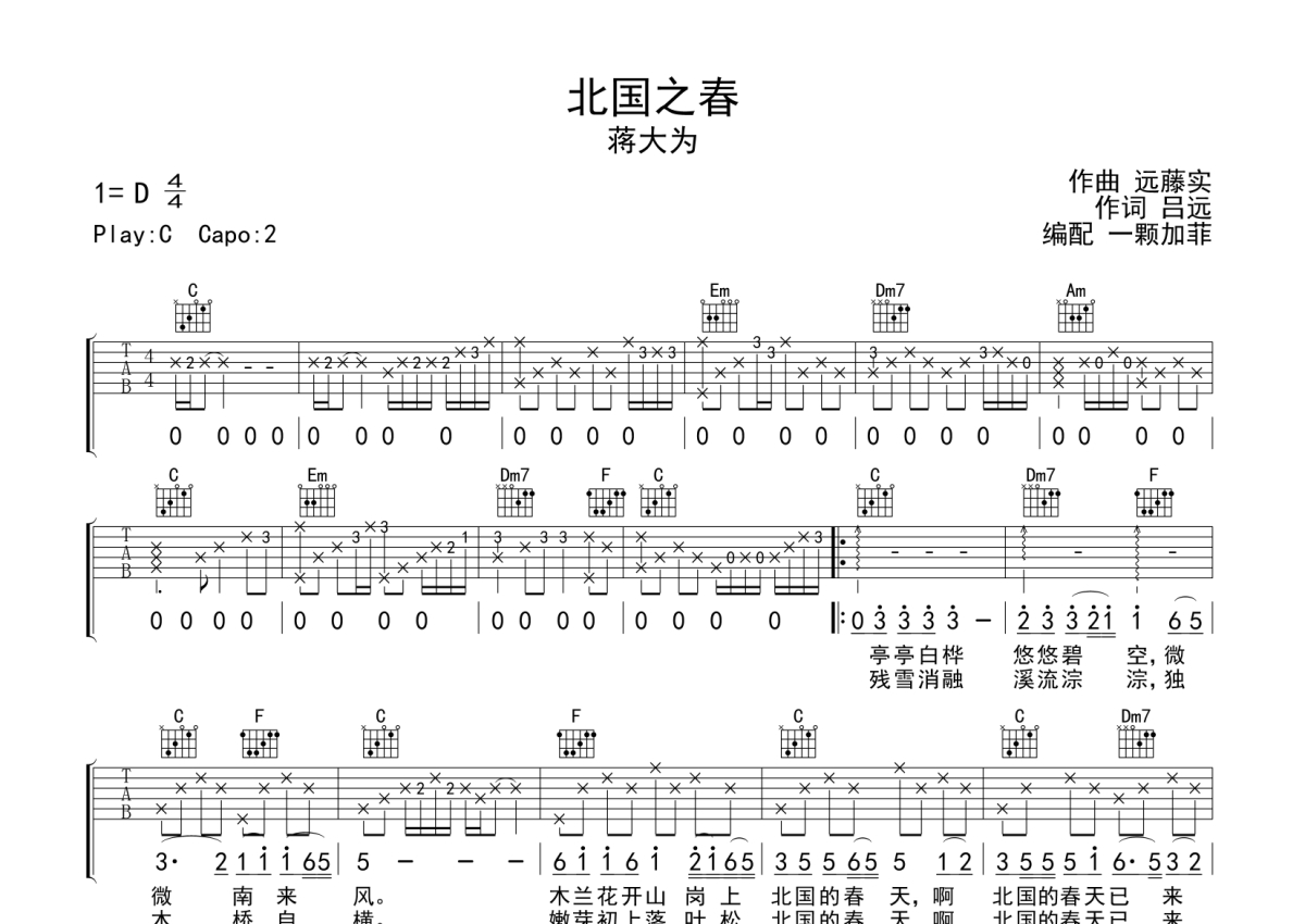 《北国之春》是蒋大为演唱的一首歌曲,本吉他谱采用的是C调指法编配,这份吉他谱共有两张高清图谱,图谱由 @一颗加菲 编配上传,图谱使用六线谱编配,包含吉他和弦指法、简谱以及歌词部分,曲谱配备了相关的音频提供试听,使用这份北国之春吉他谱,可以让你更加方便地掌握这首歌曲的弹唱技巧,快来尝试吧。