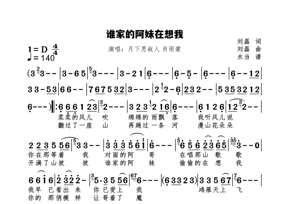 《谁家的阿妹在想我》是月下思故人 肖雨蒙演唱的一首歌曲,拍号为4/4拍,歌曲速度为每分钟140拍,这份简谱共有一张高清图谱,图谱由 @水当 编配上传原调D。