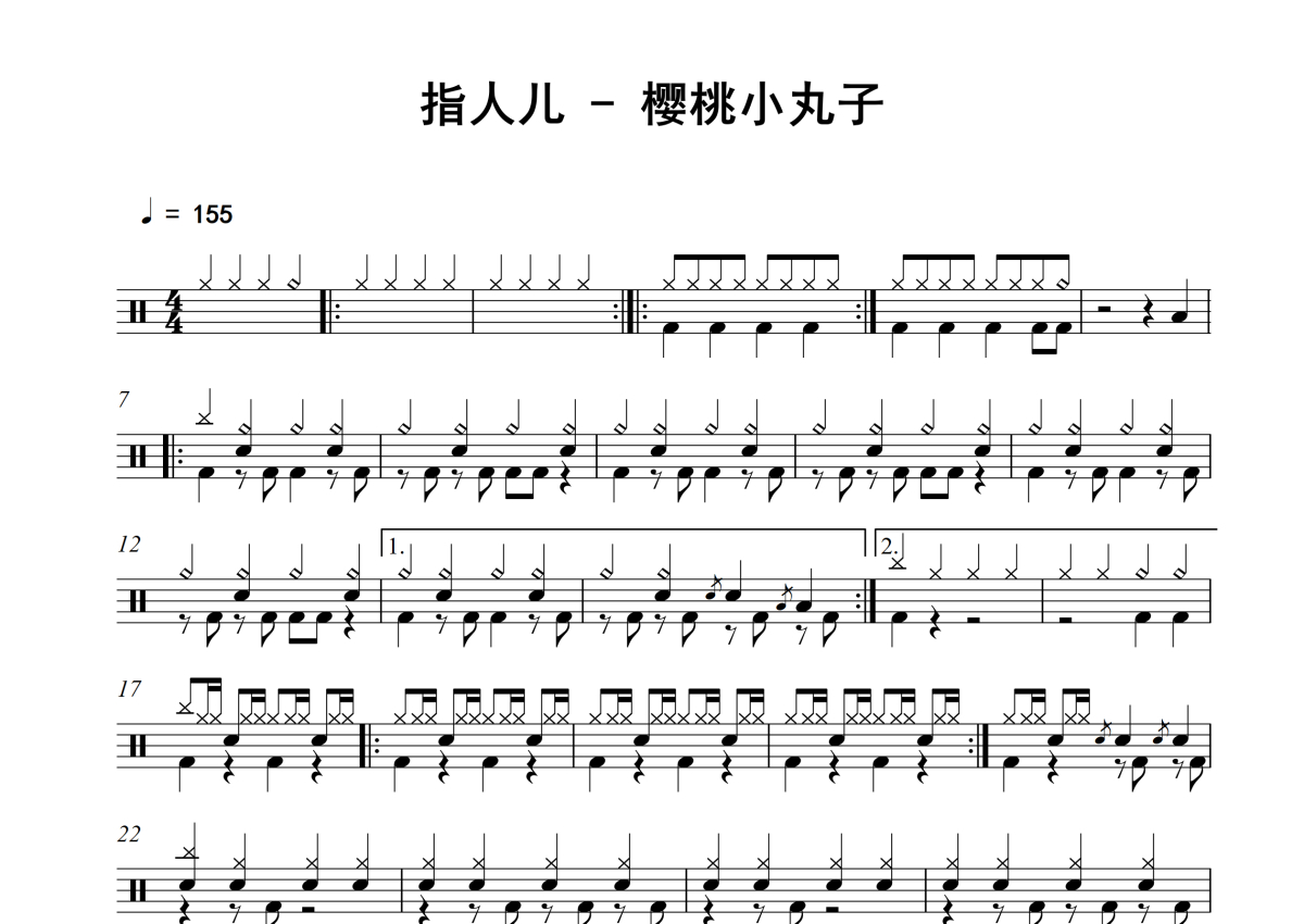《樱桃小丸子》是指人儿演唱的一首歌曲,拍号为4/4拍,歌曲速度为每分钟155拍,这份架子鼓谱共有两张高清图谱,图谱由 @庄颜 编配上传,图谱使用五线谱编配,使用这份樱桃小丸子架子鼓谱,你将能够轻松地敲打出这首指人儿的樱桃小丸子,快来尝试吧。