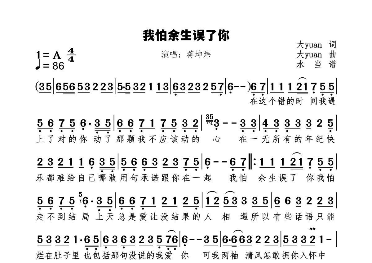 我怕余生误了你简谱 - 蒋坤炜演唱