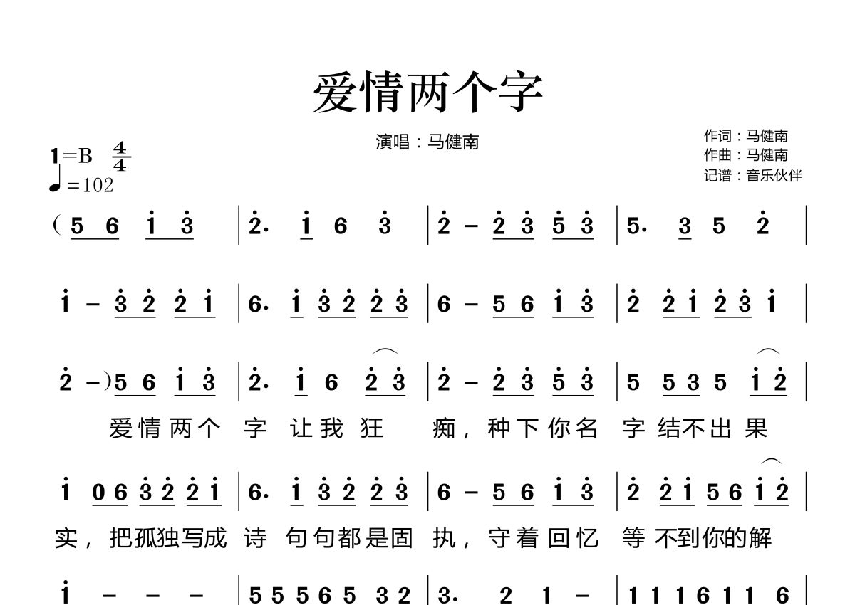 爱情两个字简谱 - 马健南演唱
